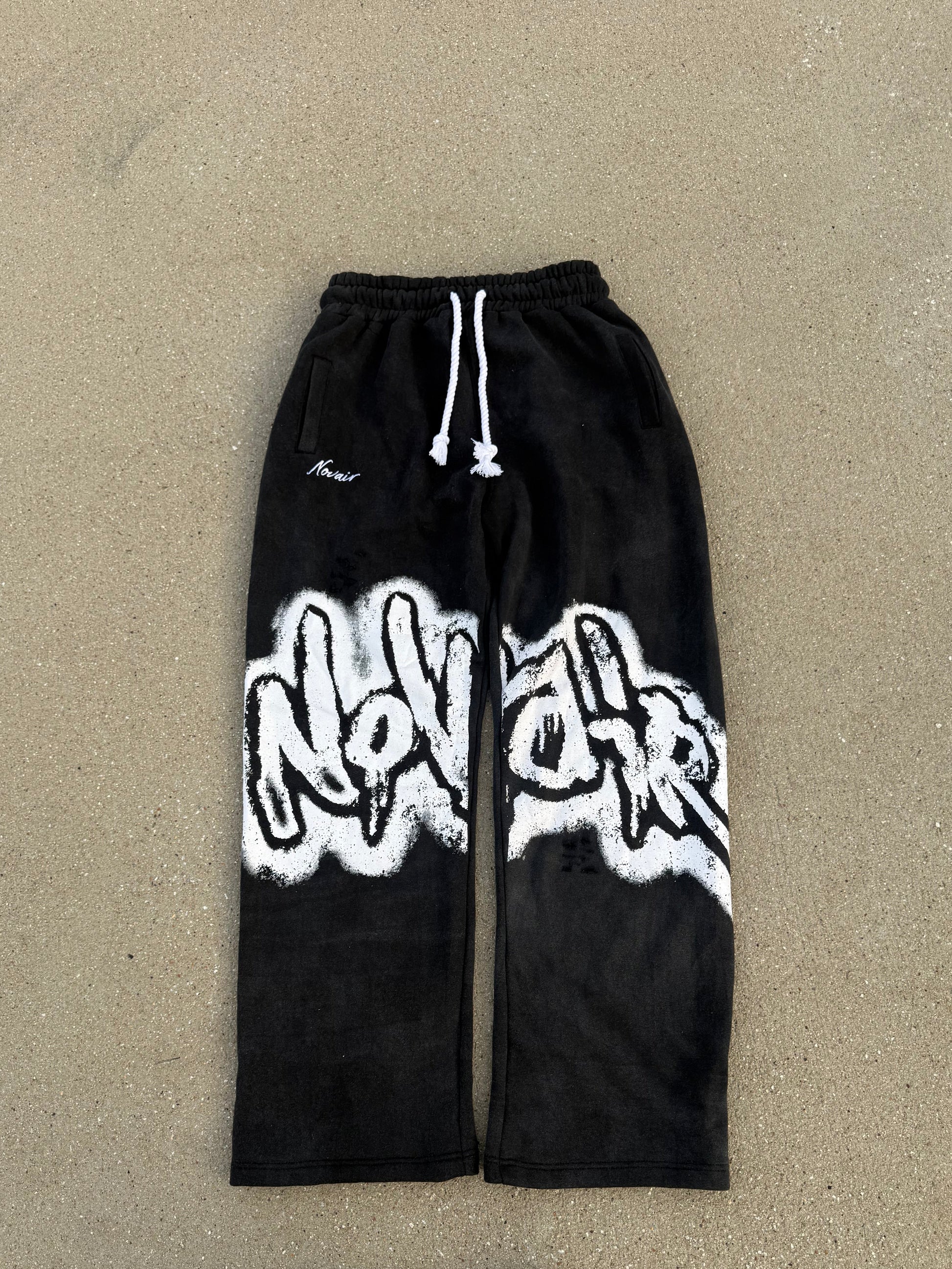 Lowkey and loud at the same time. The Onyx Black sweatpants are designed for all-day comfort and all-season wear. White logo graphics and subtle distressing give them that authentic Novair edge — heavy, relaxed, and built to last.
